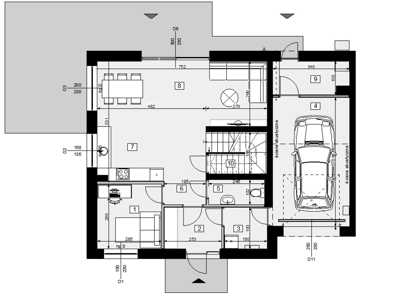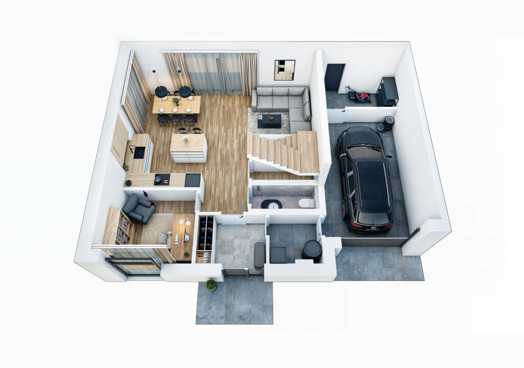 Na parterze znajduje się przestronna strefa dzienna z jasnym salonem, jadalnią oraz otwartą kuchnią, tworzące wspólnie serce domu. Dodatkowo na tym poziomie zaprojektowano praktyczny gabinet, łazienkę, wiatrołap, pomieszczenie gospodarcze oraz garaż z wydzielonym pomieszczeniem technicznym. Bezpośrednie przejście z wiatrołapu do garażu zwiększa codzienny komfort użytkowania.