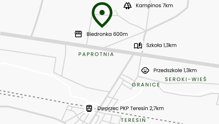 Dzięki strategicznemu położeniu w Paprotni (gmina Teresin), nasza inwestycja oferuje znakomitą dostępność komunikacyjną. Zaledwie ok. 45 km od centrum Warszawy oraz 1.8 km pieszo od stacji PKP Teresin Niepokalanów, z której kursują bezpośrednie pociągi do Warszawy.